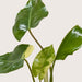 - Description: The leaves are large, arrowhead-shaped, and exhibit striking variegation, featuring splashes of creamy white, pale yellow, and bright green against a dark green backdrop.